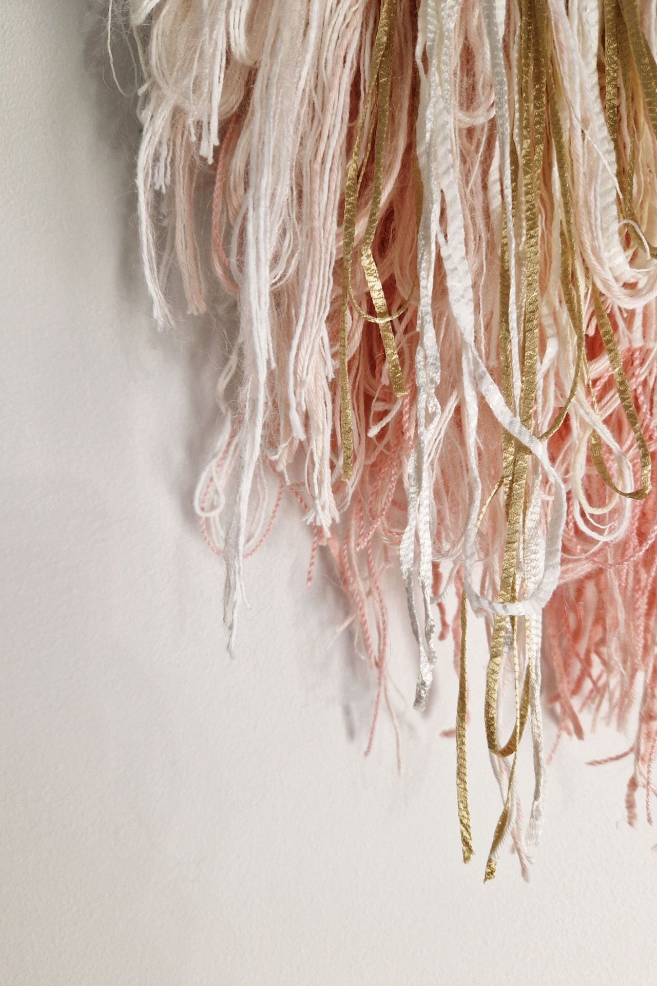 Samalla tavalla, miten seinän väri voi vaihdella paljonkin vuorokauden- ja vuodenajan mukaan, vaikuttaa valon laatu tietysti myös seinätekstiilien väreihin. Mutta se tapa, miten mä yhdistelen erilaisia lankoja yhdeksi maalaukselliseksi kokonaisuudeksi on armollinen: lankojen eri tekstuurit ja kiiltoasteet siftaavat valoa eläväisesti ja lankojen sävyt sulautuvat tilan väreihin suhteessa toisiinsa.