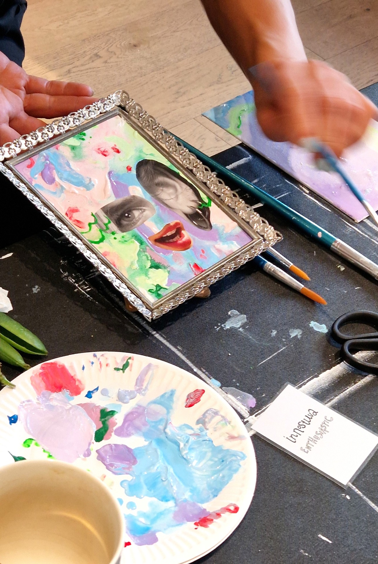 Tiimiä vahvistavien harjoitusten teemaa ja taidepajassa käytettävää tekniikkaa voidaan soveltaa tiiminne tilanteen mukaan. Maalauksen lisäksi mulla on vuosikymmenten kokemus erilaisista tekstiili- ja käsityötekniikoista. Voidaan vaikkapa solmia ryijy, kirjoa, maalata, tehdä joulukoristeita, art journal tai mosaiikkia. Materiaalit tuon mukanani, tai voimme käyttää esimerkiksi teidän omaa ylijäämämateriaalia. Jos haluatte päästä porukalla kokeilemaan jotakin tiettyä tekniikkaa, kysy ja mä kerron, pystynkö ohjaamaan, onnistuuko logistisesti ja mitä maksaisi.